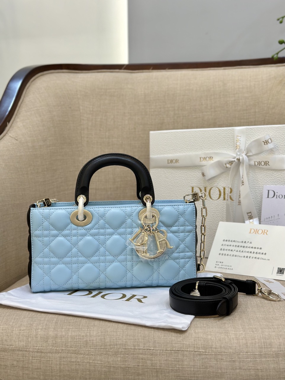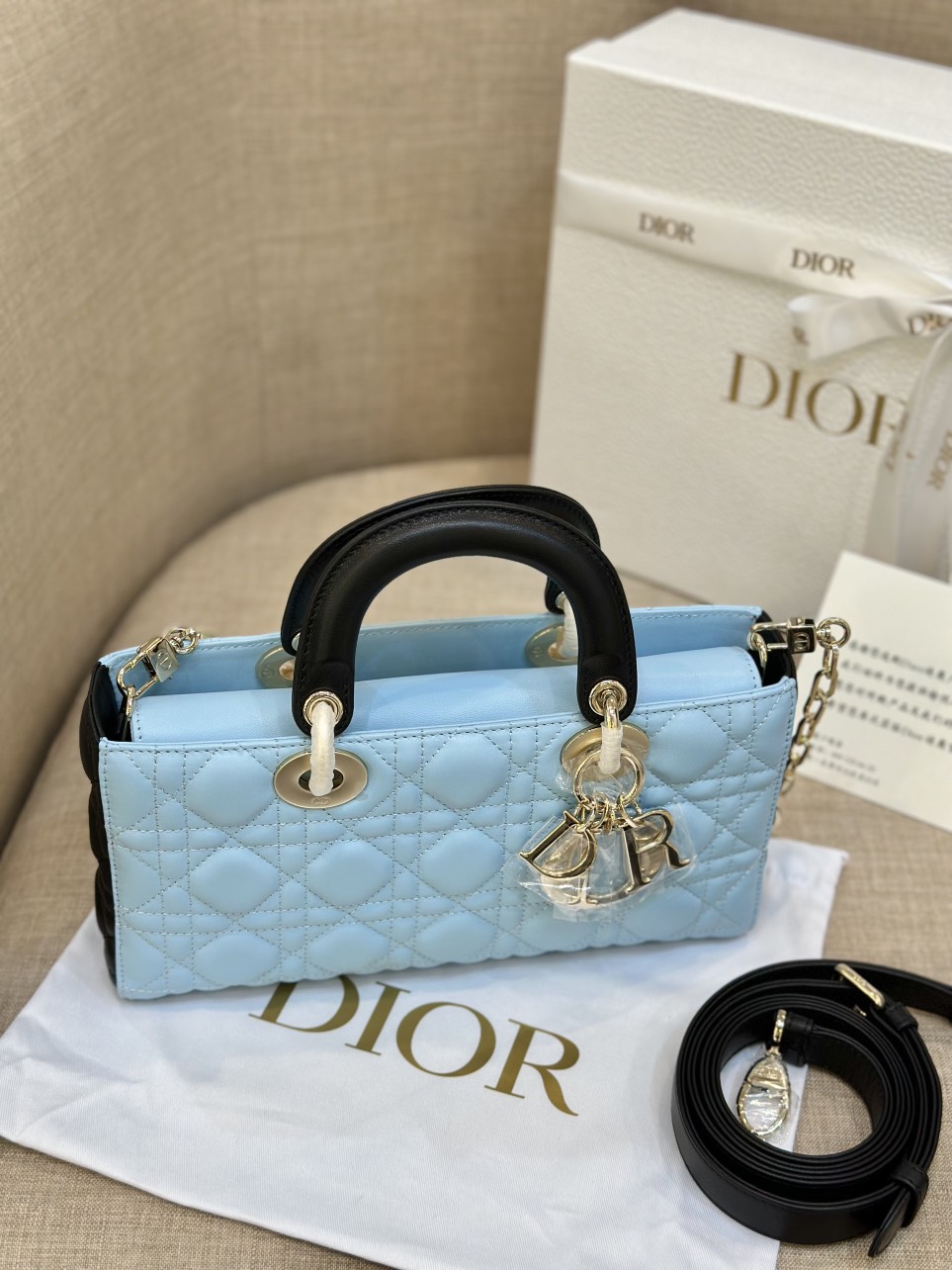 Dior D-Joy Women’s Handbag, Ice Blue Cowhide Leather, Like Auth 26cm